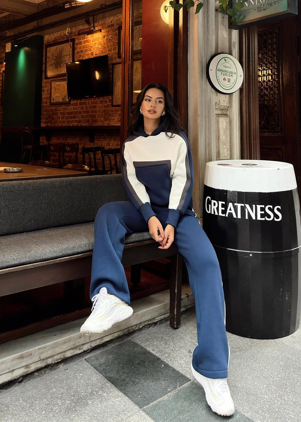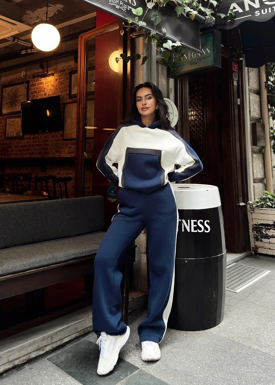 This women's two-piece tracksuit is made from 100% pure cotton and includes a hoodie and pants. The adjustable and extremely comfortable hoodie features a relaxed fit for casual wear and everyday use. The matching track pants are equally comfortable and come with an elastic waistband to ensure a perfect fit. This tracksuit is the ideal choice for cooler days and casual occasions. Thanks to its soft and warm cotton fabric, this trendy outfit will quickly become your favorite. With its modern design and stylish look, this women's tracksuit will be an indispensable addition to your wardrobe.