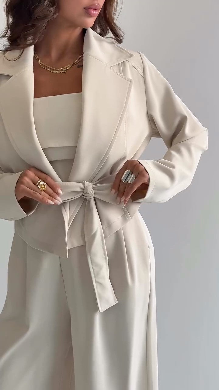 It includes a blouse with a modern design, comfortable pants with an elegant cut, and a matching scarf that adds a touch of soft luxury to the look.