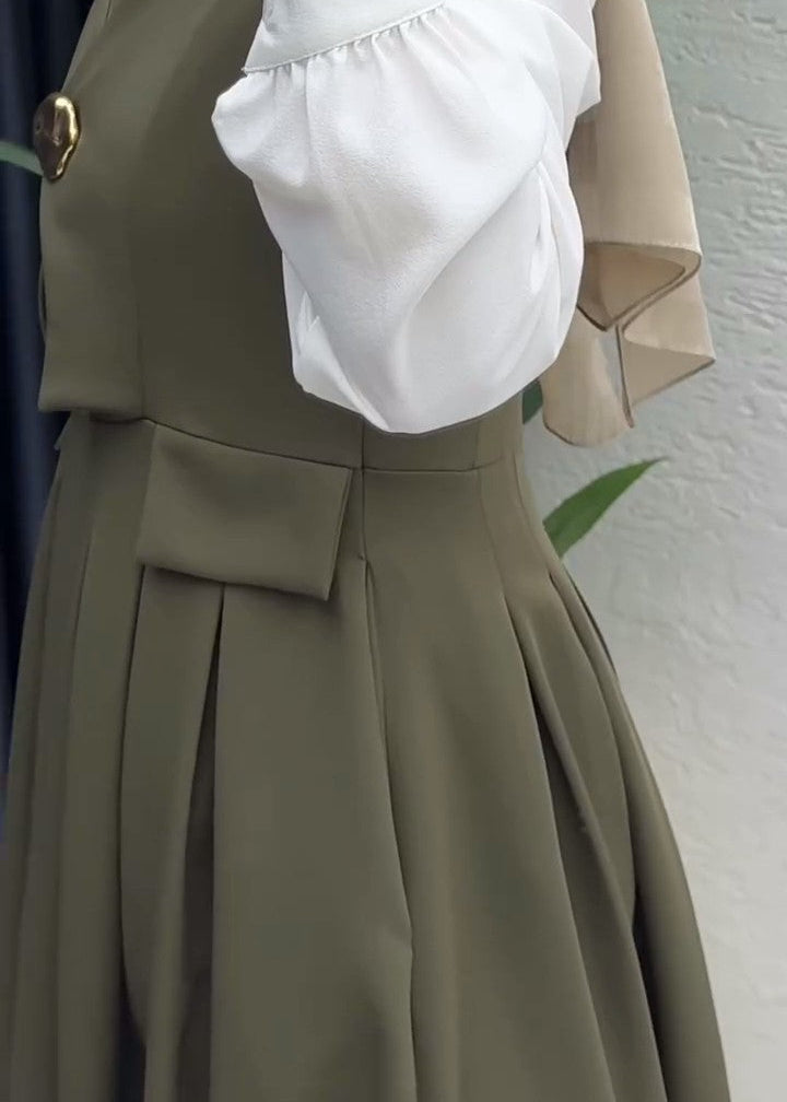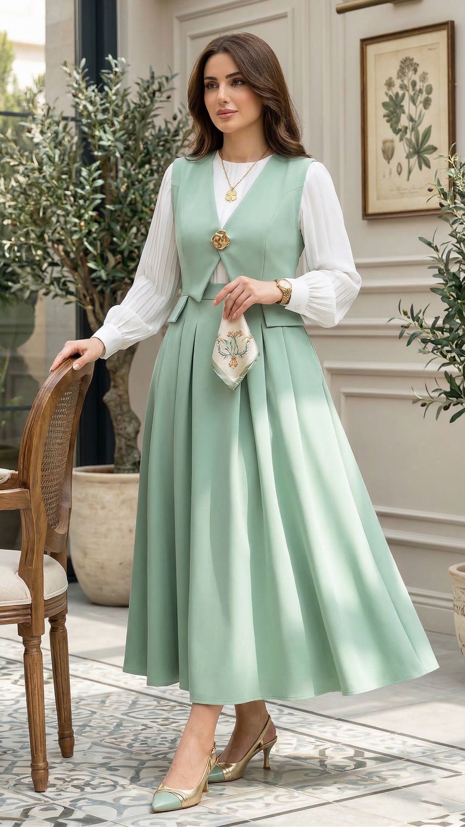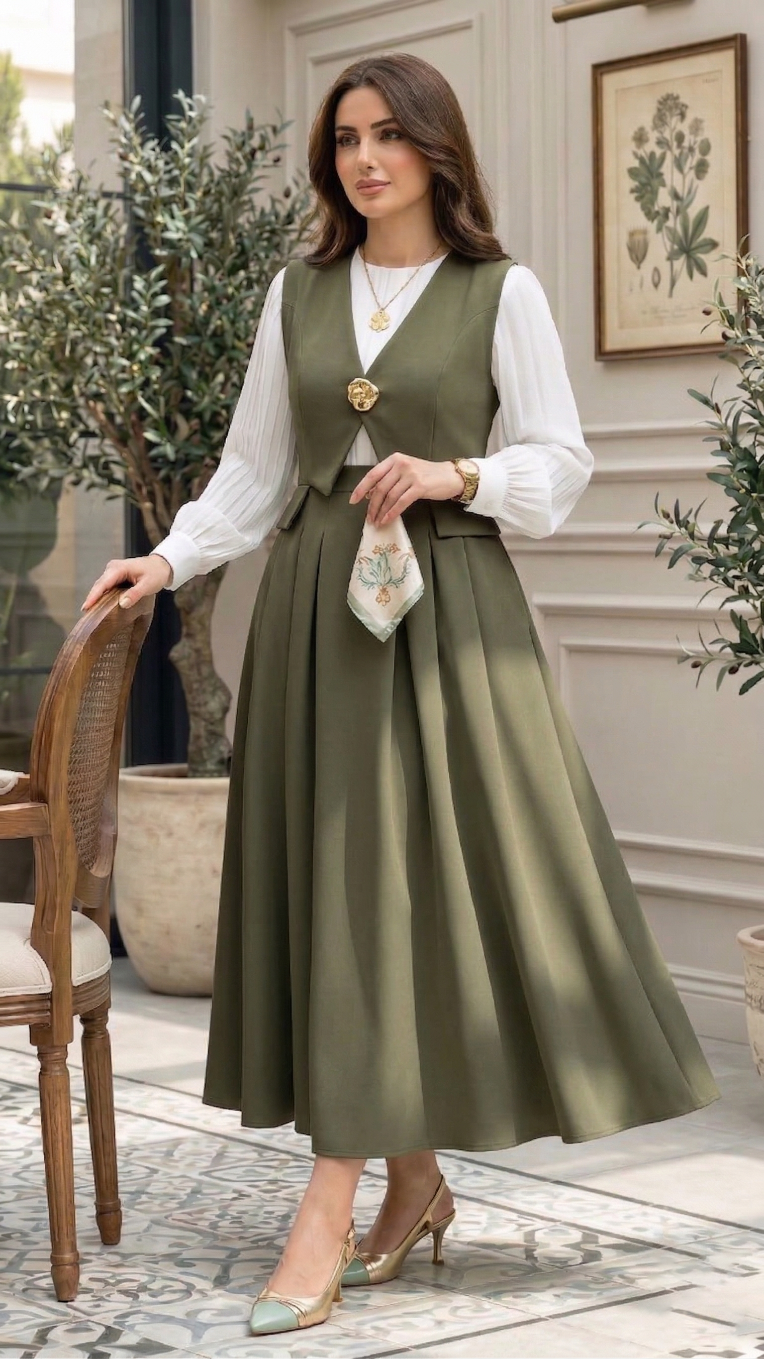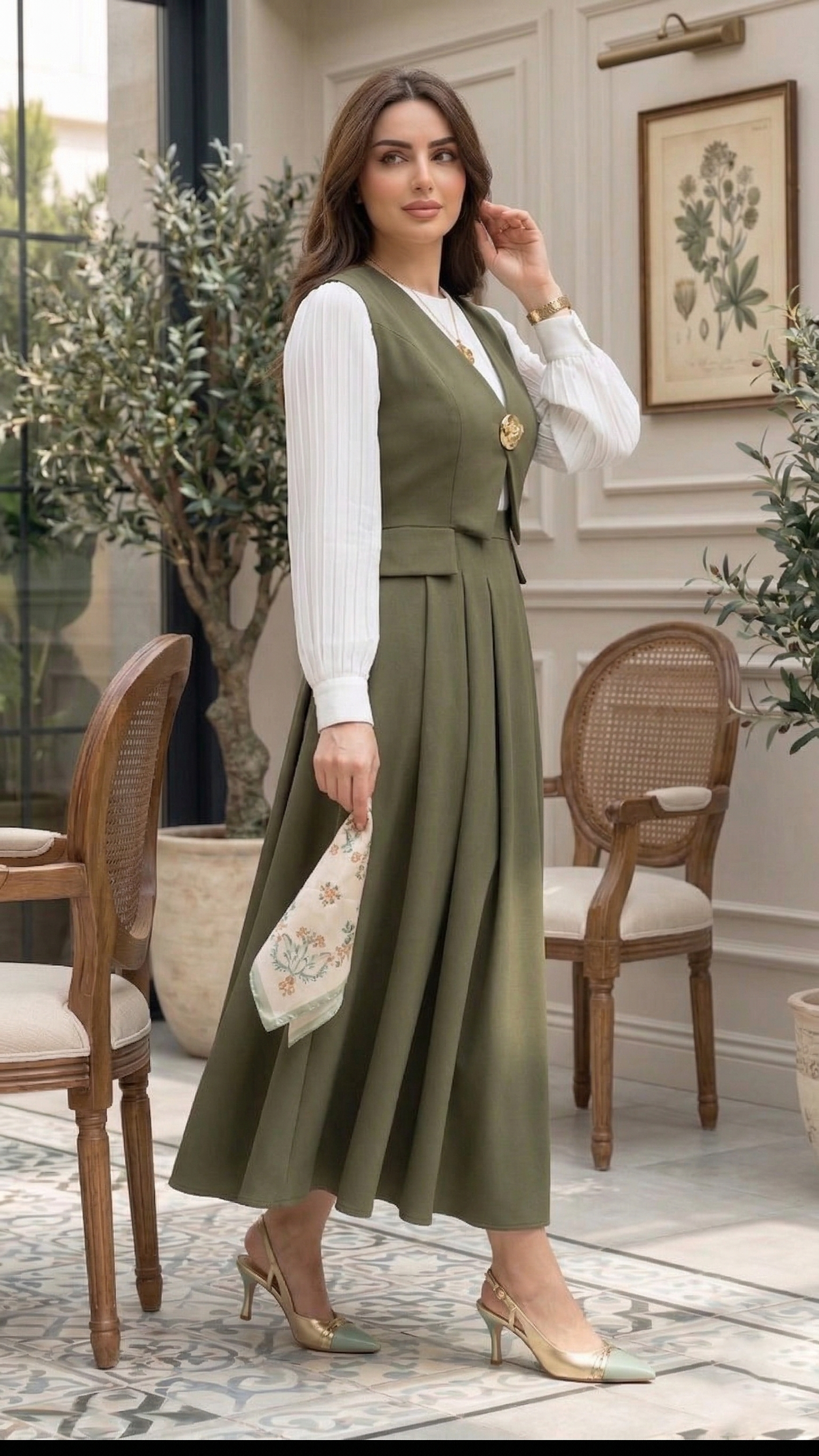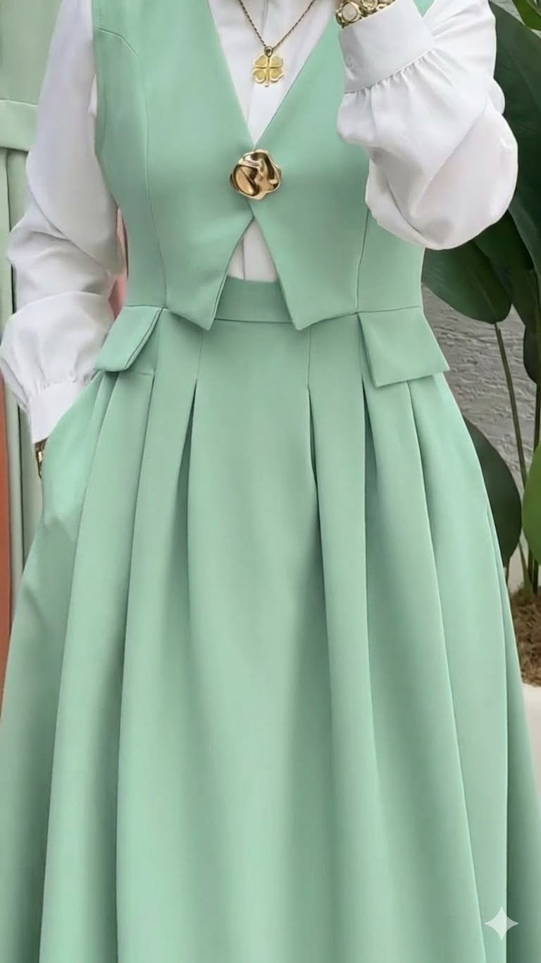 نسّقي هذا الطقم مع كعب أنيق وحقيبة صغيرة وإكسسوارات ذهبية ناعمة لتحصلي على إطلالة رسمية راقية، أو اعتمديه مع أكسسوار بسيط ولمسات هادئة ليظهر التصميم بشكل أنيق وناعم في نفس الوقت.