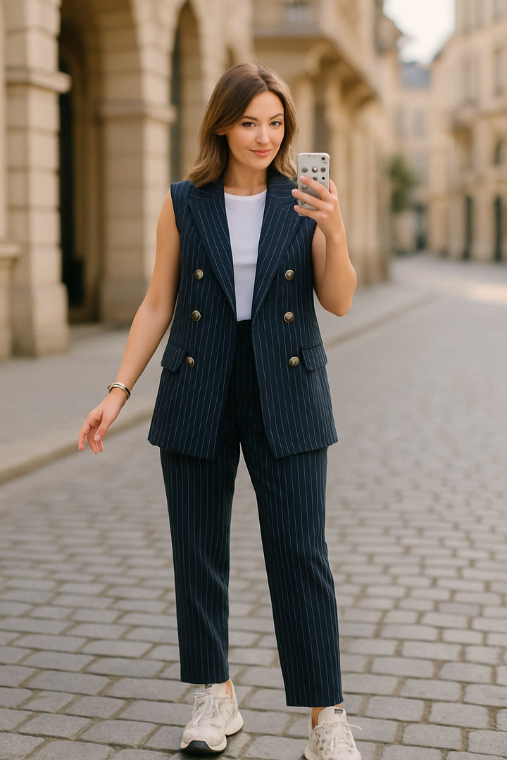 جاكت بقصة عصرية وبنطلون بقصة مريحة تعطي لوك متناسق ومثالي لكل المناسبات – شغل، اجتماعات أو خروجات كاجوال شيك.